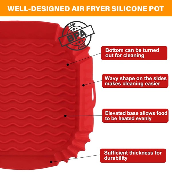 Dizajnirana s univerzalnom veličinom od 21 cm, posuda odgovara većini modela friteza na vrući zrak. Fleksibilni silikon prilagođava se različitim oblicima košara, što je čini svestranim dodatkom u svakoj kuhinji.